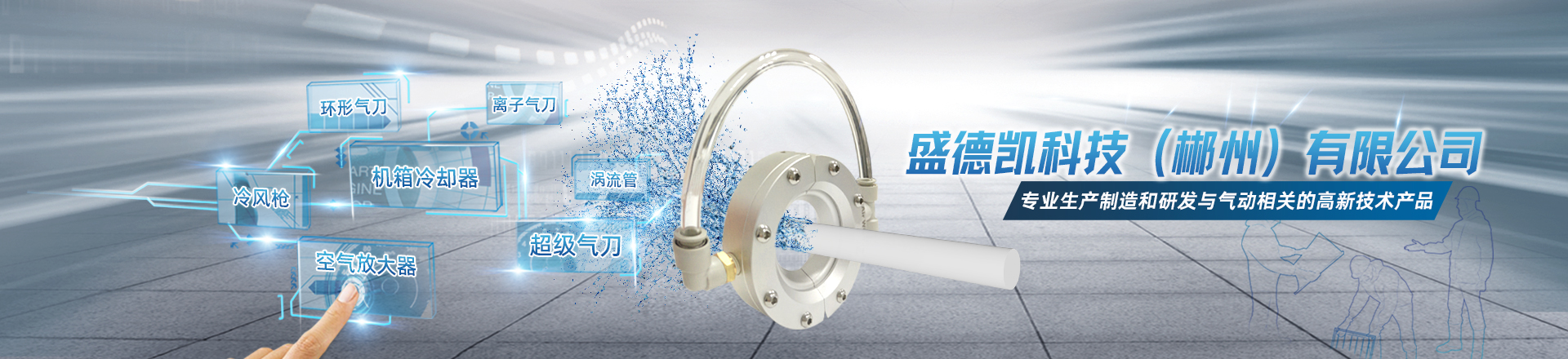 盛德凱科技(郴州)有限公司是一家生產制造和研發與氣動相關的高新技術產品。主要產品有超級氣刀,環形氣刀,靜電消除器,渦流管,機箱冷卻器,冷風槍,氣動輸送器,空氣放大器等,應用于各工業中(五金機械加工,電子電氣,食品飲料,印刷包裝,汽車制造,儀器儀表,塑膠化工),進行除塵,除水, 消除靜電,制冷降溫,干燥,吹氣,傳送物料等
